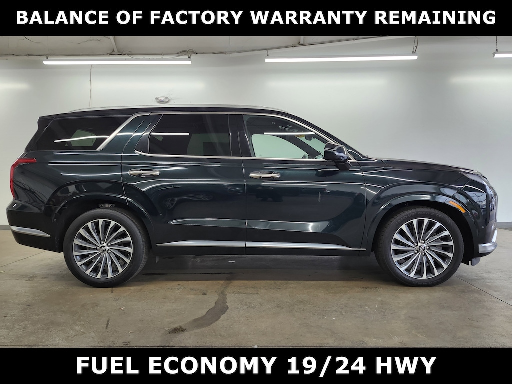 Jeff Wyler Superior Hyundai is proud to offer this good-looking 2024 Hyundai Palisade Calligraphy in Robust Emerald. Well equipped with: Option Group 01, Hyundai Certified Used Vehicles Certified, 12 Speakers, 3.648 Axle Ratio, 3rd row seats: split-bench, 4-Wheel Disc Brakes, ABS brakes, Air Conditioning, Alloy wheels, AM/FM radio: SiriusXM, Apple CarPlay & Android Auto, Auto High-beam Headlights, Auto-dimming door mirrors, Auto-dimming Rear-View mirror, Auto-leveling suspension, Automatic temperature control, Brake assist, Bumpers: body-color, Compass, Delay-off headlights, Driver door bin, Driver vanity mirror, Dual front impact airbags, Dual front side impact airbags, Electronic Stability Control, Emergency communication system, Exterior Parking Camera Rear, Four wheel independent suspension, Front anti-roll bar, Front Bucket Seats, Front Center Armrest, Front dual zone A/C, Front reading lights, Fully automatic headlights, Garage door transmitter: HomeLink, harman/kardon® Speakers, Heads-Up Display, Heated & Ventilated Front Bucket Seats, Heated door mirrors, Heated front seats, Heated rear seats, Heated steering wheel, Illuminated entry, Knee airbag, Low tire pressure warning, Memory seat, Navigation System, Occupant sensing airbag, Outside temperature display, Overhead airbag, Overhead console, Panic alarm, Passenger door bin, Passenger vanity mirror, Power door mirrors, Power driver seat, Power Liftgate, Power moonroof, Power passenger seat, Power steering, Power windows, Premium Nappa Leather Seat Trim, Radio data system, Radio: AM/FM/MP3 Premium Audio System, Rain sensing wipers, Rear air conditioning, Rear anti-roll bar, Rear audio controls, Rear reading lights, Rear side impact airbag, Rear window defroster, Rear window wiper, Reclining 3rd row seat, Remote keyless entry, Security system, Speed control, Speed-sensing steering, Split folding rear seat, Spoiler, Steering wheel mounted audio controls, Tachometer, Telescoping steering wheel, Tilt steering wheel, Traction control, Trip computer, Turn signal indicator mirrors, Variably intermittent wipers, Ventilated front seats, Ventilated rear seats, and Wheels: 20" x 7.5J Calligraphy Exclusive Alloy. CARFAX One-Owner. This sales price excludes tax, title, and dealer fees. While every reasonable effort is made to ensure the accuracy of this information, we are not responsible for any errors or omissions contained on these pages. Used vehicles 10 years of age or newer with less than 100,000 miles are eligible for the Wyler Assurance Program, but eligible vehicles must pass our reconditioning process and multi-point inspection. Provided the vehicle passes inspection, vehicles will be eligible for the 6 month/6,000 mile limited warranty. The 6 month/6,000 mile limited warranty is NOT available on AS-IS vehicles, wholesale vehicles, lease buyback/pass-thru vehicles or un-inspected vehicles. Note that this program can also apply to vehicles where the remaining factory coverage is less than 6 months or 6,000 miles. Please check the Federal Trade Commission (FTC) Buyers guide on the vehicle for full details as to whether or not warranty coverage may apply. Contact Dealer for additional details. The Wyler Assurance 6 month/6,000 Mile limited warranty ends 6 months from the date of the Retail Purchase Agreement (BUYERS ORDER) or when the vehicle's odometer registers 6,000 additional miles to the mileage listed on the BUYERS ORDER, whichever comes first.Your Deductible - The warranty holder on your contract pays the first $100 of each covered repair.