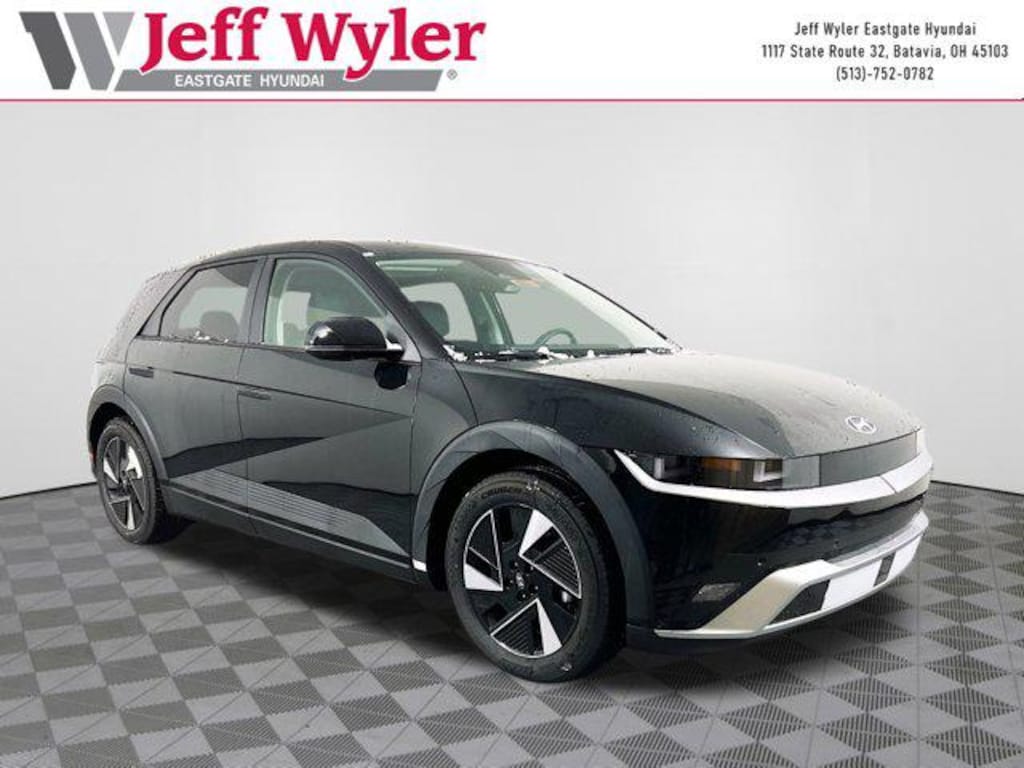 Abyss Black 2026 Hyundai IONIQ 5 SEL Electric Motor AWD 1-Speed Automatic 110/87 City/Highway MPG Jeff Wyler Eastgate Auto Mall is very proud to offer this fantastic 2026 Hyundai IONIQ 5 SEL in Abyss Black. Well equipped with: Option Group 01, 4-Wheel Disc Brakes, 6 Speakers, ABS brakes, Air Conditioning, Alloy wheels, AM/FM radio: SiriusXM, Apple CarPlay & Android Auto, Auto High-beam Headlights, Auto-dimming Rear-View mirror, Automatic temperature control, Bodyside moldings, Brake assist, Bumpers: body-color, Cargo Net, Carpeted Floor Mats, Delay-off headlights, Driver door bin, Driver vanity mirror, Dual front impact airbags, Dual front side impact airbags, Electronic Stability Control, Emergency communication system: None, First Aid Kit, Four wheel independent suspension, Front anti-roll bar, Front Bucket Seats, Front Center Armrest w/Storage, Front dual zone A/C, Front reading lights, Fully automatic headlights, Garage door transmitter: HomeLink, H-Tex Artificial Leather Seating Surfaces, harman/kardon® Speakers, Heated door mirrors, Heated Front Bucket Seats, Heated front seats, Illuminated entry, Low tire pressure warning, Navigation System, Occupant sensing airbag, Outside temperature display, Overhead airbag, Overhead console, Panic alarm, Passenger door bin, Passenger vanity mirror, Power door mirrors, Power driver seat, Power Liftgate, Power passenger seat, Power steering, Power windows, Radio: AM/FM/SiriusXM/HD Audio System, Rear anti-roll bar, Rear reading lights, Rear seat center armrest, Rear side impact airbag, Rear window defroster, Rear window wiper, Remote keyless entry, Security system, Speed control, Speed-sensing steering, Split folding rear seat, Spoiler, Steering wheel mounted audio controls, Telescoping steering wheel, Tilt steering wheel, Traction control, Trip computer, Turn signal indicator mirrors, Up Seatback Cargo Mat, Variably intermittent wipers, and Wheels: 19" x 7.5J Alloy. 110/87 City/Highway MPG