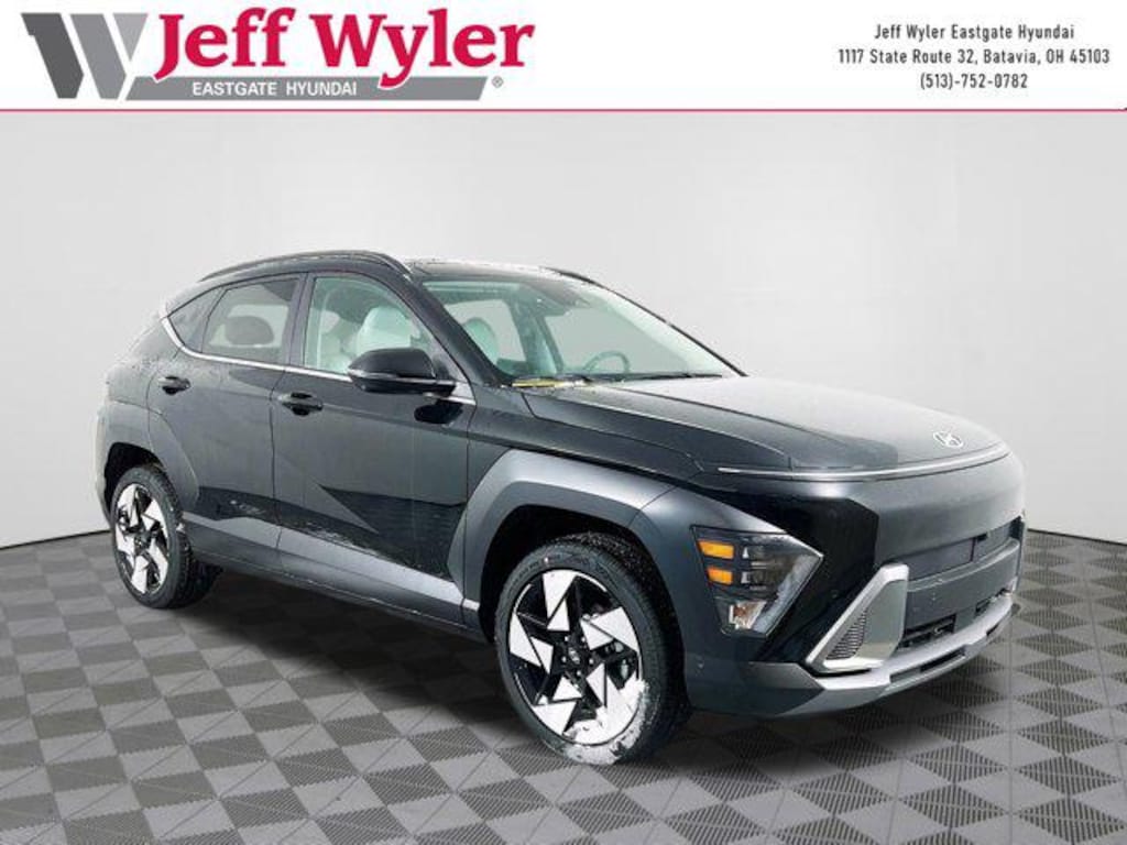 Abyss Black Pearl 2026 Hyundai Kona Limited I4 AWD 8-Speed Automatic 25/28 City/Highway MPG Jeff Wyler Eastgate Auto Mall is proud to offer this superb-looking 2026 Hyundai Kona Limited in Abyss Black Pearl. Well equipped with: Option Group 01, 4-Wheel Disc Brakes, 8 Speakers, ABS brakes, Air Conditioning, Alloy wheels, AM/FM radio: SiriusXM, Apple CarPlay & Android Auto, Auto High-beam Headlights, Auto-dimming Rear-View mirror, Automatic temperature control, Brake assist, Bumpers: body-color, Cargo Blocks, Cargo Net, Carpeted Floor Mats, Cross Rails, Delay-off headlights, Driver door bin, Driver vanity mirror, Dual front impact airbags, Dual front side impact airbags, Electronic Stability Control, Emergency communication system: None, First Aid Kit, Four wheel independent suspension, Front anti-roll bar, Front Bucket Seats, Front Center Armrest, Front dual zone A/C, Front reading lights, Fully automatic headlights, H-Tex Seat Trim, Heated and Ventilated Front Bucket Seats, Heated door mirrors, Heated front seats, Heated steering wheel, Illuminated entry, Leather steering wheel, Low tire pressure warning, Navigation System, Occupant sensing airbag, Outside temperature display, Overhead airbag, Panic alarm, Passenger door bin, Passenger vanity mirror, Power door mirrors, Power driver seat, Power Liftgate, Power moonroof, Power steering, Power windows, Radio: AM/FM/SiriusXM/HD Audio System, Rear anti-roll bar, Rear seat center armrest, Rear window defroster, Rear window wiper, Remote keyless entry, Security system, Speed control, Speed-sensing steering, Split folding rear seat, Spoiler, Steering wheel mounted audio controls, Tachometer, Telescoping steering wheel, Tilt steering wheel, Traction control, Trip computer, Turn signal indicator mirrors, Variably intermittent wipers, Ventilated front seats, and Wheels: 19" x 7.5J Silver/Black Alloy. 25/28 City/Highway MPG. Photos are for illustration purposes only.