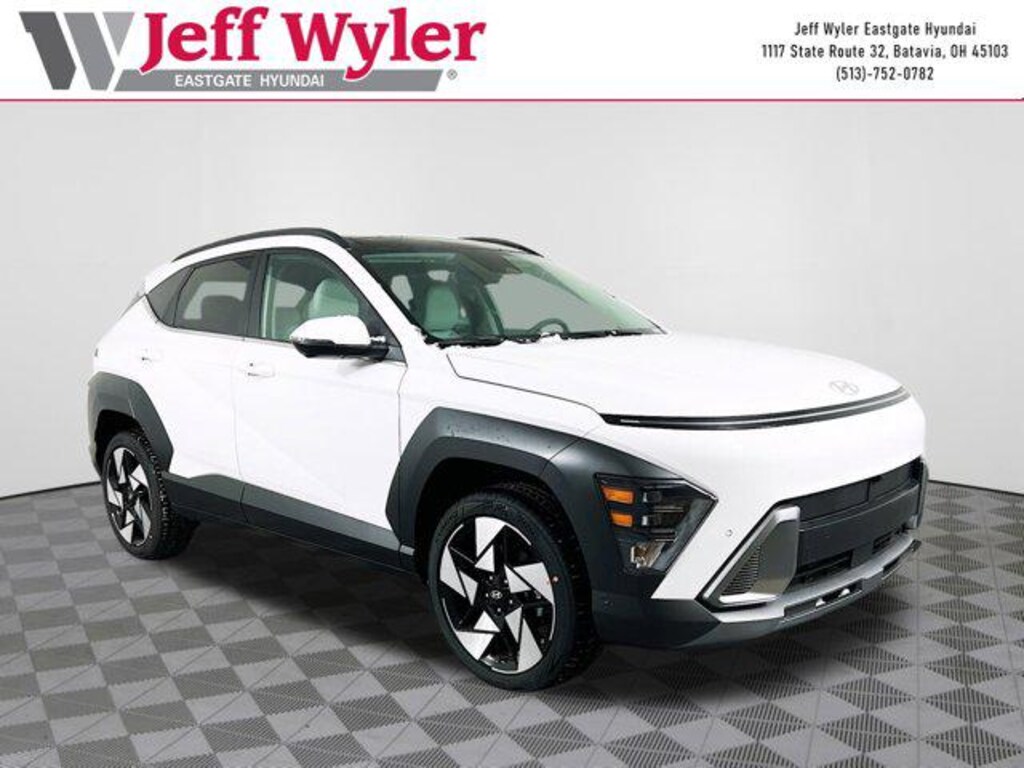 Atlas White 2026 Hyundai Kona Limited I4 AWD 8-Speed Automatic 25/28 City/Highway MPG Jeff Wyler Eastgate Auto Mall is pleased to offer this terrific-looking 2026 Hyundai Kona Limited in Atlas White. Well equipped with: Option Group 01, 4-Wheel Disc Brakes, 8 Speakers, ABS brakes, Air Conditioning, Alloy wheels, AM/FM radio: SiriusXM, Apple CarPlay & Android Auto, Auto High-beam Headlights, Auto-dimming Rear-View mirror, Automatic temperature control, Brake assist, Bumpers: body-color, Cargo Blocks, Cargo Net, Carpeted Floor Mats, Cross Rails, Delay-off headlights, Driver door bin, Driver vanity mirror, Dual front impact airbags, Dual front side impact airbags, Electronic Stability Control, Emergency communication system: None, First Aid Kit, Four wheel independent suspension, Front anti-roll bar, Front Bucket Seats, Front Center Armrest, Front dual zone A/C, Front reading lights, Fully automatic headlights, H-Tex Seat Trim, Heated and Ventilated Front Bucket Seats, Heated door mirrors, Heated front seats, Heated steering wheel, Illuminated entry, Leather steering wheel, Low tire pressure warning, Navigation System, Occupant sensing airbag, Outside temperature display, Overhead airbag, Panic alarm, Passenger door bin, Passenger vanity mirror, Power door mirrors, Power driver seat, Power Liftgate, Power moonroof, Power steering, Power windows, Radio: AM/FM/SiriusXM/HD Audio System, Rear anti-roll bar, Rear seat center armrest, Rear window defroster, Rear window wiper, Remote keyless entry, Security system, Speed control, Speed-sensing steering, Split folding rear seat, Spoiler, Steering wheel mounted audio controls, Tachometer, Telescoping steering wheel, Tilt steering wheel, Traction control, Trip computer, Turn signal indicator mirrors, Variably intermittent wipers, Ventilated front seats, and Wheels: 19" x 7.5J Silver/Black Alloy. 25/28 City/Highway MPG