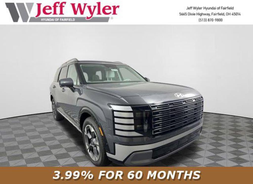 Priced below KBB Fair Purchase Price! 2026 Hyundai Palisade Ecotronic Gray Pearl Limited AWD 8-Speed Automatic V6 Android Auto, Apple CarPlay, CALL NOW FOR YOUR VIP APPOINTMENT 513-870-9800, FULLY SERVICED w/RECORDS, GUARANTEED FINANCING!! NO MATTER YOUR SITUATION WE CAN GET AN APPROVAL!!, THE #1 Volume dealer in the region! Come see why for yourself Today!!, WE PAY MORE FOR YOUR TRADE!!. Jeff Wyler Hyundai of Fairfield is pumped up to offer this terrific-looking 2026 Hyundai Palisade Limited in Ecotronic Gray Pearl. Well equipped with: Option Group 01, Android Auto, Apple CarPlay, CALL NOW FOR YOUR VIP APPOINTMENT 513-870-9800, FULLY SERVICED w/RECORDS, GUARANTEED FINANCING!! NO MATTER YOUR SITUATION WE CAN GET AN APPROVAL!!, THE #1 Volume dealer in the region! Come see why for yourself Today!!, WE PAY MORE FOR YOUR TRADE!!, 14 Speakers, 3rd row seats: split-bench, 4-Wheel Disc Brakes, ABS brakes, Air Conditioning, Alloy wheels, AM/FM radio: SiriusXM, Apple CarPlay & Android Auto, Audio memory, Auto High-beam Headlights, Auto-dimming door mirrors, Auto-dimming Rear-View mirror, Auto-leveling suspension, Automatic temperature control, Brake assist, Bumpers: body-color, Cargo Cover, Cargo Net, Cargo Tray, Carpeted Floor Mats, Compass, Delay-off headlights, Driver door bin, Driver vanity mirror, Dual front impact airbags, Dual front side impact airbags, Electronic Stability Control, Emergency communication system: None, Exterior Parking Camera Rear, Four wheel independent suspension, Front anti-roll bar, Front Bucket Seats, Front Center Armrest, Front dual zone A/C, Front reading lights, Fully automatic headlights, Garage door transmitter: HomeLink, Genuine wood console insert, Genuine wood dashboard insert, Heated and Ventilated Front Bucket Seats, Heated door mirrors, Heated front seats, Heated rear seats, Heated steering wheel, HVAC memory, Illuminated entry, Knee airbag, Leather Seat Trim, Leather steering wheel, Low tire pressure warning, Memory seat, Navigation System, Occupant sensing airbag, Outside temperature display, Overhead airbag, Overhead console, Panic alarm, Passenger door bin, Passenger vanity mirror, Power door mirrors, Power driver seat, Power Liftgate, Power moonroof, Power passenger seat, Power steering, Power windows, Radio data system, Radio: Infotainment Navigation System, Rear air conditioning, Rear anti-roll bar, Rear audio controls, Rear reading lights, Rear side impact airbag, Rear window defroster, Rear window wiper, Reclining 3rd row seat, Remote keyless entry, Security system, Speed control, Split folding rear seat, Spoiler, Steering wheel mounted audio controls, Tachometer, Telescoping steering wheel, Tilt steering wheel, Traction control, Trip computer, Turn signal indicator mirrors, Variably intermittent wipers, Ventilated front seats, Ventilated rear seats, and Wheels: 20" x 8.0J Alloy. Price includes: $400 - College Graduate Program. Exp. 03/02/2026 $500 - Military Program. Exp. 03/02/2026 $750 - Hyundai HMF Dealer Choice : $750 discount and 5.39% APR for 24 months. $44.05 per $1000 financed. Available to well qualified buyers who finance through Hyundai Motor Finance. H704. Exp. 03/02/2026