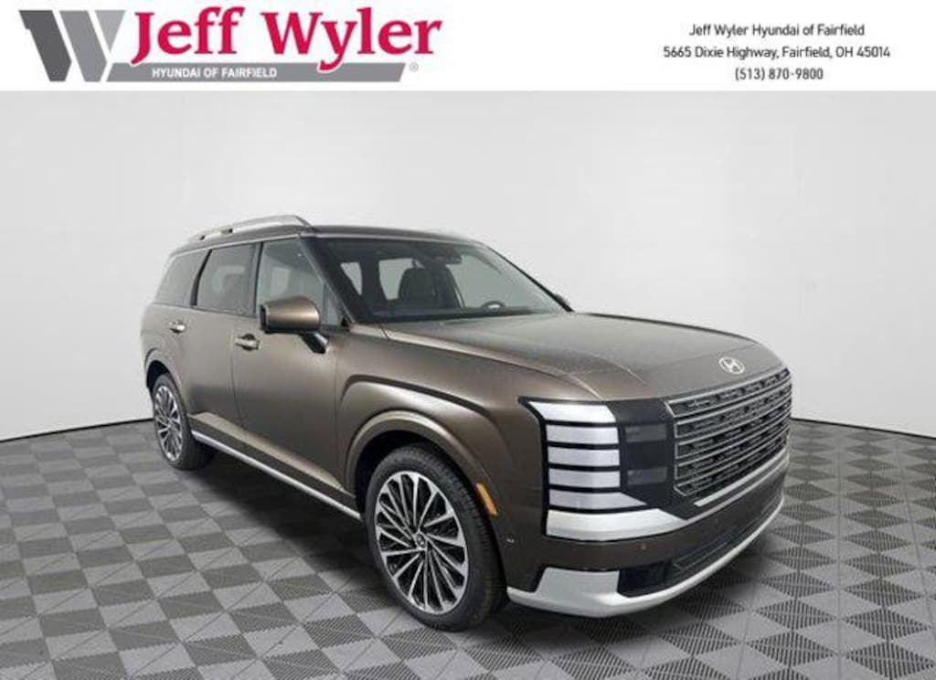 Priced below KBB Fair Purchase Price! 2026 Hyundai Palisade Cast Iron Brown Pearl SEL Premium 7 Passenger AWD 8-Speed Automatic V6 Android Auto, Apple CarPlay, CALL NOW FOR YOUR VIP APPOINTMENT 513-870-9800, FULLY SERVICED w/RECORDS, GUARANTEED FINANCING!! NO MATTER YOUR SITUATION WE CAN GET AN APPROVAL!!, THE #1 Volume dealer in the region! Come see why for yourself Today!!, WE PAY MORE FOR YOUR TRADE!!. Jeff Wyler Hyundai of Fairfield is honored to offer this attractive 2026 Hyundai Palisade SEL Premium in Cast Iron Brown Pearl. Well equipped with: Option Group 01, Android Auto, Apple CarPlay, CALL NOW FOR YOUR VIP APPOINTMENT 513-870-9800, FULLY SERVICED w/RECORDS, GUARANTEED FINANCING!! NO MATTER YOUR SITUATION WE CAN GET AN APPROVAL!!, THE #1 Volume dealer in the region! Come see why for yourself Today!!, WE PAY MORE FOR YOUR TRADE!!, 3rd row seats: split-bench, 4-Wheel Disc Brakes, 8 Speakers, ABS brakes, Air Conditioning, Alloy wheels, AM/FM radio: SiriusXM, Apple CarPlay & Android Auto, Audio memory, Auto High-beam Headlights, Auto-dimming door mirrors, Auto-dimming Rear-View mirror, Auto-leveling suspension, Automatic temperature control, Brake assist, Bumpers: body-color, Cargo Mat, Up Seatback, Cargo Net, Carpeted Floor Mats, Compass, Delay-off headlights, Driver door bin, Driver vanity mirror, Dual front impact airbags, Dual front side impact airbags, Electronic Stability Control, Emergency communication system: None, Exterior Parking Camera Rear, First Aid Kit, Four wheel independent suspension, Front anti-roll bar, Front Bucket Seats, Front Center Armrest, Front dual zone A/C, Front reading lights, Fully automatic headlights, Garage door transmitter: HomeLink, H-Tex Leatherette Seat Trim, Heated and Ventilated Front Bucket Seats, Heated door mirrors, Heated front seats, Heated rear seats, Heated steering wheel, HVAC memory, Illuminated entry, Knee airbag, Leather steering wheel, Low tire pressure warning, Memory seat, Mud Guards, Navigation System, Occupant sensing airbag, Outside temperature display, Overhead airbag, Overhead console, Panic alarm, Passenger door bin, Passenger vanity mirror, Power door mirrors, Power driver seat, Power Liftgate, Power moonroof, Power passenger seat, Power steering, Power windows, Radio data system, Radio: Infotainment Navigation System, Rear air conditioning, Rear anti-roll bar, Rear audio controls, Rear reading lights, Rear side impact airbag, Rear window defroster, Rear window wiper, Reclining 3rd row seat, Remote keyless entry, Roadside Assistance Kit, Security system, Speed control, Split folding rear seat, Spoiler, Steering wheel mounted audio controls, Tachometer, Telescoping steering wheel, Tilt steering wheel, Traction control, Trip computer, Turn signal indicator mirrors, Variably intermittent wipers, Ventilated front seats, Ventilated rear seats, and Wheels: 18" x 8.0J Alloy. Price includes: $400 - College Graduate Program. Exp. 03/02/2026 $500 - Military Program. Exp. 03/02/2026 $750 - Hyundai HMF Dealer Choice : $750 discount and 5.39% APR for 24 months. $44.05 per $1000 financed. Available to well qualified buyers who finance through Hyundai Motor Finance. H704. Exp. 03/02/2026