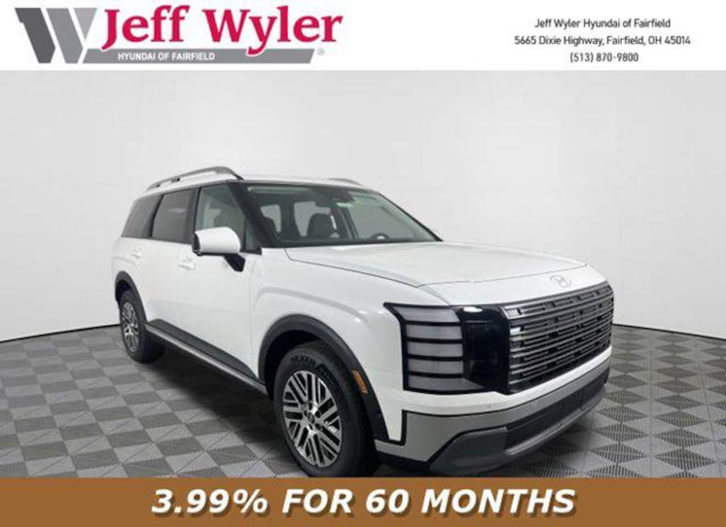 Priced below KBB Fair Purchase Price! 2026 Hyundai Palisade Creamy White Pearl SEL Premium 7 Passenger AWD 8-Speed Automatic V6 Android Auto, Apple CarPlay, CALL NOW FOR YOUR VIP APPOINTMENT 513-870-9800, FULLY SERVICED w/RECORDS, GUARANTEED FINANCING!! NO MATTER YOUR SITUATION WE CAN GET AN APPROVAL!!, THE #1 Volume dealer in the region! Come see why for yourself Today!!, WE PAY MORE FOR YOUR TRADE!!. Jeff Wyler Hyundai of Fairfield is pumped up to offer this superb-looking 2026 Hyundai Palisade SEL Premium in Creamy White Pearl. Well equipped with: Option Group 01, Android Auto, Apple CarPlay, CALL NOW FOR YOUR VIP APPOINTMENT 513-870-9800, FULLY SERVICED w/RECORDS, GUARANTEED FINANCING!! NO MATTER YOUR SITUATION WE CAN GET AN APPROVAL!!, THE #1 Volume dealer in the region! Come see why for yourself Today!!, WE PAY MORE FOR YOUR TRADE!!, 3rd row seats: split-bench, 4-Wheel Disc Brakes, 8 Speakers, ABS brakes, Air Conditioning, Alloy wheels, AM/FM radio: SiriusXM, Apple CarPlay & Android Auto, Audio memory, Auto High-beam Headlights, Auto-dimming door mirrors, Auto-dimming Rear-View mirror, Auto-leveling suspension, Automatic temperature control, Brake assist, Bumpers: body-color, Cargo Cover, Cargo Mat, Up Seatback, Cargo Net, Carpeted Floor Mats, Compass, Delay-off headlights, Driver door bin, Driver vanity mirror, Dual front impact airbags, Dual front side impact airbags, Electronic Stability Control, Emergency communication system: None, Exterior Parking Camera Rear, First Aid Kit, Four wheel independent suspension, Front anti-roll bar, Front Bucket Seats, Front Center Armrest, Front dual zone A/C, Front reading lights, Fully automatic headlights, Garage door transmitter: HomeLink, H-Tex Leatherette Seat Trim, Heated and Ventilated Front Bucket Seats, Heated door mirrors, Heated front seats, Heated rear seats, Heated steering wheel, HVAC memory, Illuminated entry, Knee airbag, Leather steering wheel, Low tire pressure warning, Memory seat, Navigation System, Occupant sensing airbag, Outside temperature display, Overhead airbag, Overhead console, Panic alarm, Passenger door bin, Passenger vanity mirror, Power door mirrors, Power driver seat, Power Liftgate, Power moonroof, Power passenger seat, Power steering, Power windows, Radio data system, Radio: Infotainment Navigation System, Rear air conditioning, Rear anti-roll bar, Rear audio controls, Rear reading lights, Rear side impact airbag, Rear window defroster, Rear window wiper, Reclining 3rd row seat, Remote keyless entry, Security system, Speed control, Split folding rear seat, Spoiler, Steering wheel mounted audio controls, Tachometer, Telescoping steering wheel, Tilt steering wheel, Traction control, Trip computer, Turn signal indicator mirrors, Variably intermittent wipers, Ventilated front seats, Ventilated rear seats, and Wheels: 18" x 8.0J Alloy. Price includes: $400 - College Graduate Program. Exp. 03/02/2026 $500 - Military Program. Exp. 03/02/2026 $750 - Hyundai HMF Dealer Choice : $750 discount and 5.39% APR for 24 months. $44.05 per $1000 financed. Available to well qualified buyers who finance through Hyundai Motor Finance. H704. Exp. 03/02/2026