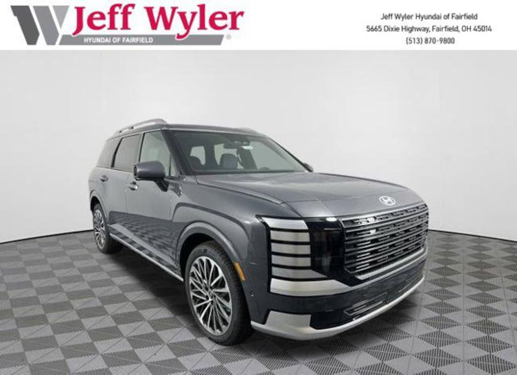 Priced below KBB Fair Purchase Price! 2026 Hyundai Palisade Ecotronic Gray Pearl Calligraphy AWD 8-Speed Automatic V6 Android Auto, Apple CarPlay, CALL NOW FOR YOUR VIP APPOINTMENT 513-870-9800, FULLY SERVICED w/RECORDS, GUARANTEED FINANCING!! NO MATTER YOUR SITUATION WE CAN GET AN APPROVAL!!, THE #1 Volume dealer in the region! Come see why for yourself Today!!, WE PAY MORE FOR YOUR TRADE!!. Jeff Wyler Hyundai of Fairfield is very proud to offer this handsome 2026 Hyundai Palisade Calligraphy in Ecotronic Gray Pearl. Well equipped with: Option Group 01, Android Auto, Apple CarPlay, CALL NOW FOR YOUR VIP APPOINTMENT 513-870-9800, FULLY SERVICED w/RECORDS, GUARANTEED FINANCING!! NO MATTER YOUR SITUATION WE CAN GET AN APPROVAL!!, THE #1 Volume dealer in the region! Come see why for yourself Today!!, WE PAY MORE FOR YOUR TRADE!!, 14 Speakers, 3rd row seats: split-bench, 4-Wheel Disc Brakes, ABS brakes, Air Conditioning, Alloy wheels, AM/FM radio: SiriusXM, Apple CarPlay & Android Auto, Audio memory, Auto High-beam Headlights, Auto-dimming door mirrors, Auto-dimming Rear-View mirror, Auto-leveling suspension, Automatic temperature control, Brake assist, Bumpers: body-color, Cargo Cover, Cargo Tray, Carpeted Floor Mats, Compass, Delay-off headlights, Driver door bin, Driver vanity mirror, Dual front impact airbags, Dual front side impact airbags, Electronic Stability Control, Emergency communication system: None, Exterior Parking Camera Rear, First Aid Kit, Four wheel independent suspension, Front anti-roll bar, Front Bucket Seats, Front Center Armrest, Front dual zone A/C, Front reading lights, Fully automatic headlights, Garage door transmitter: HomeLink, Genuine wood console insert, Genuine wood dashboard insert, Heads-Up Display, Heated and Ventilated Front Bucket Seats, Heated door mirrors, Heated front seats, Heated rear seats, Heated steering wheel, HVAC memory, Illuminated entry, Knee airbag, Leather steering wheel, Low tire pressure warning, Memory seat, Navigation System, Occupant sensing airbag, Outside temperature display, Overhead airbag, Overhead console, Panic alarm, Passenger door bin, Passenger vanity mirror, Power door mirrors, Power driver seat, Power Liftgate, Power moonroof, Power passenger seat, Power steering, Power windows, Premium Nappa Leather Seat Trim, Radio data system, Radio: Infotainment Navigation System, Rain sensing wipers, Rear air conditioning, Rear anti-roll bar, Rear audio controls, Rear reading lights, Rear side impact airbag, Rear window defroster, Rear window wiper, Reclining 3rd row seat, Remote keyless entry, Security system, Speed control, Split folding rear seat, Spoiler, Steering wheel mounted audio controls, Tachometer, Telescoping steering wheel, Tilt steering wheel, Traction control, Trip computer, Turn signal indicator mirrors, Variably intermittent wipers, Ventilated front seats, Ventilated rear seats, and Wheels: 21" x 8.5J Alloy. Price includes: $1000 - Sales Event Cash. Exp. 03/02/2026 $400 - College Graduate Program. Exp. 03/02/2026 $500 - Military Program. Exp. 03/02/2026 $750 - Hyundai HMF Dealer Choice : $750 discount and 5.39% APR for 24 months. $44.05 per $1000 financed. Available to well qualified buyers who finance through Hyundai Motor Finance. H704. Exp. 03/02/2026