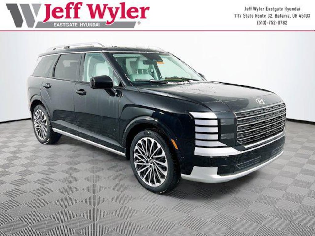 Abyss Black Pearl 2026 Hyundai Palisade Calligraphy V6 AWD 8-Speed Automatic 18/24 City/Highway MPG Jeff Wyler Eastgate Auto Mall is delighted to offer this good-looking 2026 Hyundai Palisade Calligraphy in Abyss Black Pearl. Well equipped with: Option Group 01, 100W Charging Cable, 14 Speakers, 3rd row seats: split-bench, 4-Wheel Disc Brakes, ABS brakes, Air Conditioning, Alloy wheels, AM/FM radio: SiriusXM, Apple CarPlay & Android Auto, Audio memory, Auto High-beam Headlights, Auto-dimming door mirrors, Auto-dimming Rear-View mirror, Auto-leveling suspension, Automatic temperature control, Brake assist, Bumpers: body-color, Cargo Net, Cargo Tray, Carpeted Floor Mats, Compass, Delay-off headlights, Driver door bin, Driver vanity mirror, Dual front impact airbags, Dual front side impact airbags, Electronic Stability Control, Emergency communication system: None, Exterior Parking Camera Rear, First Aid Kit, Four wheel independent suspension, Front anti-roll bar, Front Bucket Seats, Front Center Armrest, Front dual zone A/C, Front reading lights, Fully automatic headlights, Garage door transmitter: HomeLink, Genuine wood console insert, Genuine wood dashboard insert, Heads-Up Display, Heated and Ventilated Front Bucket Seats, Heated door mirrors, Heated front seats, Heated rear seats, Heated steering wheel, HVAC memory, Illuminated entry, Knee airbag, Leather steering wheel, Low tire pressure warning, Memory seat, Mud Guards, Navigation System, Occupant sensing airbag, Outside temperature display, Overhead airbag, Overhead console, Panic alarm, Passenger door bin, Passenger vanity mirror, Power door mirrors, Power driver seat, Power Liftgate, Power moonroof, Power passenger seat, Power steering, Power windows, Premium Nappa Leather Seat Trim, Radio data system, Radio: Infotainment Navigation System, Rain sensing wipers, Rear air conditioning, Rear anti-roll bar, Rear audio controls, Rear reading lights, Rear side impact airbag, Rear window defroster, Rear window wiper, Reclining 3rd row seat, Remote keyless entry, Roadside Assistance Kit, Security system, Speed control, Split folding rear seat, Spoiler, Steering wheel mounted audio controls, Tachometer, Telescoping steering wheel, Tilt steering wheel, Traction control, Trip computer, Turn signal indicator mirrors, Variably intermittent wipers, Ventilated front seats, Ventilated rear seats, and Wheels: 21" x 8.5J Alloy. Price includes: $1000 - Sales Event Cash. Exp. 03/02/2026