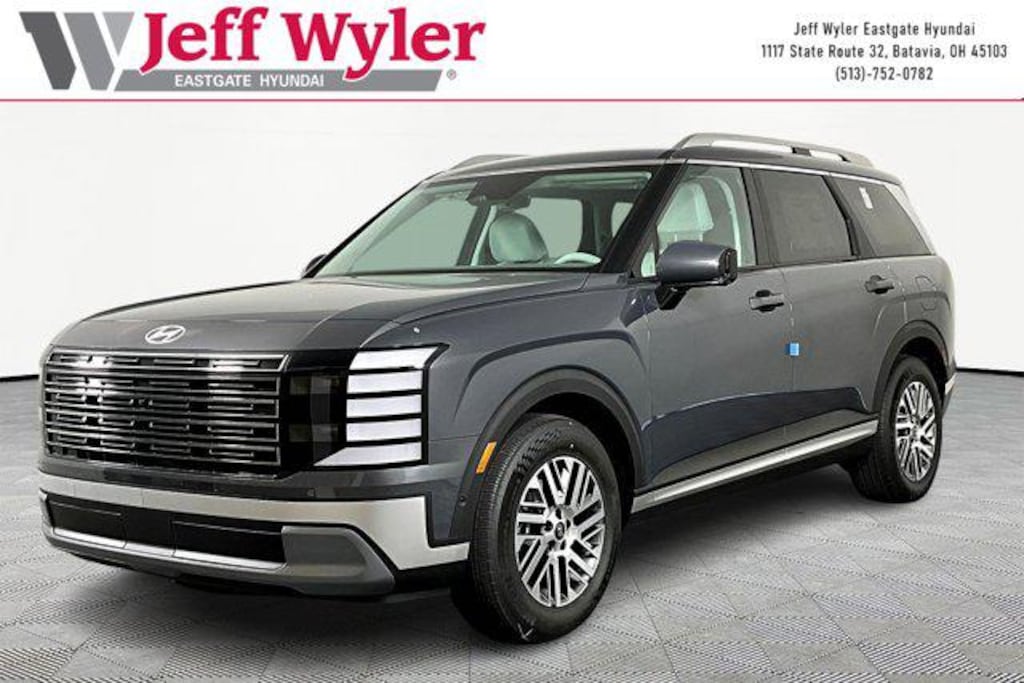 Ecotronic Gray Pearl 2026 Hyundai Palisade SEL Premium 7 Passenger V6 AWD 8-Speed Automatic 18/24 City/Highway MPG Jeff Wyler Eastgate Auto Mall is excited to offer this good-looking 2026 Hyundai Palisade SEL Premium in Ecotronic Gray Pearl. Well equipped with: Option Group 01, 100W Charging Cable, 3rd row seats: split-bench, 4-Wheel Disc Brakes, 8 Speakers, ABS brakes, Air Conditioning, Alloy wheels, AM/FM radio: SiriusXM, Apple CarPlay & Android Auto, Audio memory, Auto High-beam Headlights, Auto-dimming door mirrors, Auto-dimming Rear-View mirror, Auto-leveling suspension, Automatic temperature control, Brake assist, Bumpers: body-color, Cargo Tray, Carpeted Floor Mats, Compass, Cross Rails, Delay-off headlights, Driver door bin, Driver vanity mirror, Dual front impact airbags, Dual front side impact airbags, Electronic Stability Control, Emergency communication system: None, Exterior Parking Camera Rear, First Aid Kit, Four wheel independent suspension, Front anti-roll bar, Front Bucket Seats, Front Center Armrest, Front dual zone A/C, Front reading lights, Fully automatic headlights, Garage door transmitter: HomeLink, H-Tex Leatherette Seat Trim, Heated and Ventilated Front Bucket Seats, Heated door mirrors, Heated front seats, Heated rear seats, Heated steering wheel, HVAC memory, Illuminated entry, Knee airbag, Leather steering wheel, Low tire pressure warning, Memory seat, Navigation System, Occupant sensing airbag, Outside temperature display, Overhead airbag, Overhead console, Panic alarm, Passenger door bin, Passenger vanity mirror, Power door mirrors, Power driver seat, Power Liftgate, Power moonroof, Power passenger seat, Power steering, Power windows, Radio data system, Radio: Infotainment Navigation System, Rear air conditioning, Rear anti-roll bar, Rear audio controls, Rear Bumper Applique, Rear reading lights, Rear side impact airbag, Rear window defroster, Rear window wiper, Reclining 3rd row seat, Remote keyless entry, Security system, Speed control, Split folding rear seat, Spoiler, Steering wheel mounted audio controls, Tachometer, Telescoping steering wheel, Tilt steering wheel, Traction control, Trip computer, Turn signal indicator mirrors, Variably intermittent wipers, Ventilated front seats, Ventilated rear seats, and Wheels: 18" x 8.0J Alloy.