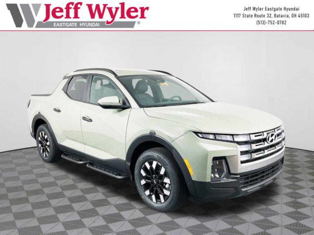 Sage Gray 2026 Hyundai Santa Cruz SEL 2.5L I4 AWD 8-Speed Automatic with SHIFTRONIC 21/29 City/Highway MPG Jeff Wyler Eastgate Auto Mall is honored to offer this charming 2026 Hyundai Santa Cruz SEL in Sage Gray. Well equipped with: Option Group 01, 18" x 7.5J Alloy Wheels, 4-Wheel Disc Brakes, 4.081 Axle Ratio, 6 Speakers, ABS brakes, Air Conditioning, Alloy wheels, AM/FM radio: SiriusXM, Apple CarPlay & Android Auto, Auto High-beam Headlights, Auto-leveling suspension, Automatic temperature control, Bed Cargo Net, Brake assist, Bumpers: body-color, Carpeted Floor Mats, Compass, Delay-off headlights, Driver door bin, Driver vanity mirror, Dual front impact airbags, Dual front side impact airbags, Electronic Stability Control, Emergency communication system: None, Exterior Parking Camera Rear, First Aid Kit, Four wheel independent suspension, Front anti-roll bar, Front Bucket Seats, Front Center Armrest, Front dual zone A/C, Front reading lights, Fully automatic headlights, H-Tex Leatherette Seat Trim, Heated door mirrors, Heated Front Bucket Seats, Heated front seats, Illuminated entry, Low tire pressure warning, Occupant sensing airbag, Outside temperature display, Overhead airbag, Overhead console, Panic alarm, Passenger door bin, Passenger vanity mirror, Power door mirrors, Power driver seat, Power moonroof, Power steering, Power windows, Radio data system, Radio: AM/FM/HD Audio System, Rear anti-roll bar, Rear reading lights, Rear side impact airbag, Rear step bumper, Rear window defroster, Remote keyless entry, Security system, Severe Weather Kit, Side Steps, Speed control, Speed-sensing steering, Split folding rear seat, Spoiler, Steering wheel mounted audio controls, Tachometer, Telescoping steering wheel, Tilt steering wheel, Traction control, Trip computer, Turn signal indicator mirrors, and Variably intermittent wipers. 21/29 City/Highway MPG Price includes: $1750 - Retail Bonus Cash. Exp. 03/02/2026
