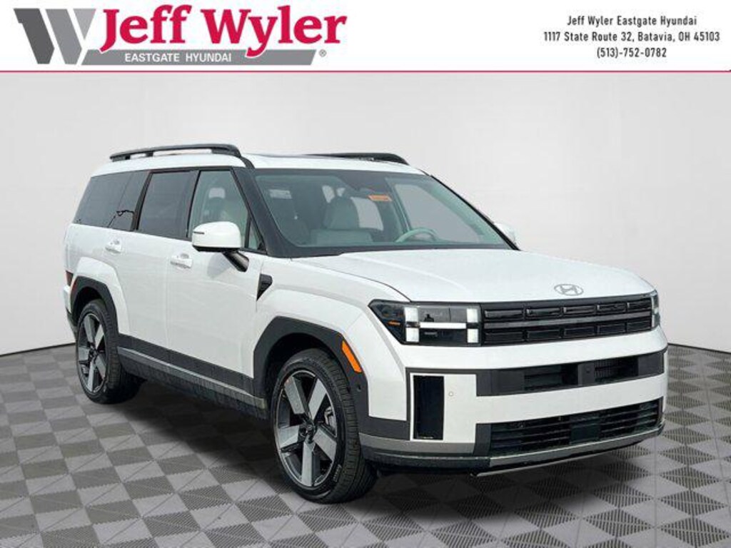 Serenity White 2026 Hyundai Santa Fe Limited 2.5L I4 AWD 8-Speed Automatic with SHIFTRONIC 20/28 City/Highway MPG Jeff Wyler Eastgate Auto Mall is excited to offer this outstanding-looking 2026 Hyundai Santa Fe Limited in Serenity White. Well equipped with: 12 Speakers, 3rd row seats: bench, 4-Wheel Disc Brakes, ABS brakes, Air Conditioning, Alloy wheels, AM/FM radio: SiriusXM, Apple CarPlay & Android Auto, Auto High-beam Headlights, Auto-dimming Rear-View mirror, Automatic temperature control, Brake assist, Bumpers: body-color, Cargo Cover/Screen, Cargo Net, Cargo Tray, Carpeted Floor Mats, Delay-off headlights, Driver door bin, Driver vanity mirror, Dual front impact airbags, Dual front side impact airbags, Electronic Stability Control, Emergency communication system, Exterior Parking Camera Rear, First Aid Kit, Four wheel independent suspension, Front anti-roll bar, Front Bucket Seats, Front Center Armrest, Front dual zone A/C, Front reading lights, Fully automatic headlights, Garage door transmitter: HomeLink, Heated and Ventilated Front Bucket Seats, Heated door mirrors, Heated front seats, Heated rear seats, Heated steering wheel, Illuminated entry, Knee airbag, Leather Seat Trim, Leather steering wheel, Low tire pressure warning, Memory seat, Navigation System, Occupant sensing airbag, Outside temperature display, Overhead airbag, Overhead console, Panic alarm, Passenger door bin, Passenger vanity mirror, Power door mirrors, Power driver seat, Power Liftgate, Power moonroof, Power passenger seat, Power steering, Power windows, Radio: AM/FM/HD Bose Premium Audio System, Rain sensing wipers, Rear anti-roll bar, Rear side impact airbag, Rear window defroster, Rear window wiper, Remote keyless entry, Security system, Speed control, Speed-sensing steering, Split folding rear seat, Spoiler, Steering wheel mounted audio controls, Tachometer, Telescoping steering wheel, Tilt steering wheel, Traction control, Trip computer, Turn signal indicator mirrors, Variably intermittent wipers, Ventilated front seats, and Wheels: 20" x 8.5J Alloy. 20/28 City/Highway MPG