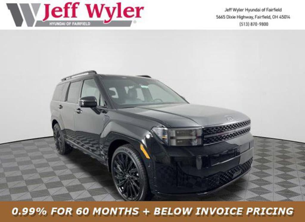 Priced below KBB Fair Purchase Price! 2026 Hyundai Santa Fe Phantom Black Calligraphy AWD 8-Speed Automatic with SHIFTRONIC 2.5L I4 AWD, Black Leather, Android Auto, Apple CarPlay, CALL NOW FOR YOUR VIP APPOINTMENT 513-870-9800, FULLY SERVICED w/RECORDS, GUARANTEED FINANCING!! NO MATTER YOUR SITUATION WE CAN GET AN APPROVAL!!, THE #1 Volume dealer in the region! Come see why for yourself Today!!, WE PAY MORE FOR YOUR TRADE!!. 20/28 City/Highway MPG Jeff Wyler Hyundai of Fairfield is honored to offer this wonderful 2026 Hyundai Santa Fe Calligraphy in Phantom Black. Well equipped with: Option Group 01, AWD, Black Leather, Android Auto, Apple CarPlay, CALL NOW FOR YOUR VIP APPOINTMENT 513-870-9800, FULLY SERVICED w/RECORDS, GUARANTEED FINANCING!! NO MATTER YOUR SITUATION WE CAN GET AN APPROVAL!!, THE #1 Volume dealer in the region! Come see why for yourself Today!!, WE PAY MORE FOR YOUR TRADE!!, 12 Speakers, 3rd row seats: bench, 4-Wheel Disc Brakes, ABS brakes, Air Conditioning, Alloy wheels, AM/FM radio: SiriusXM, Apple CarPlay & Android Auto, Auto High-beam Headlights, Auto-dimming Rear-View mirror, Automatic temperature control, Brake assist, Bumpers: body-color, Cargo Blocks, Cargo Cover/Screen, Cargo Net, Carpeted Floor Mats, Delay-off headlights, Driver door bin, Driver vanity mirror, Dual front impact airbags, Dual front side impact airbags, Electronic Stability Control, Emergency communication system, Exterior Parking Camera Rear, First Aid Kit, Four wheel independent suspension, Front anti-roll bar, Front Bucket Seats, Front Center Armrest, Front dual zone A/C, Front reading lights, Fully automatic headlights, Garage door transmitter: HomeLink, Heads-Up Display, Heated and Ventilated Front Bucket Seats, Heated door mirrors, Heated front seats, Heated rear seats, Heated steering wheel, Illuminated entry, Knee airbag, Leather steering wheel, Low tire pressure warning, Memory seat, Mudguards, Navigation System, Occupant sensing airbag, Outside temperature display, Overhead airbag, Overhead console, Panic alarm, Passenger door bin, Passenger vanity mirror, Power door mirrors, Power driver seat, Power Liftgate, Power moonroof, Power passenger seat, Power steering, Power windows, Quilted Premium Nappa Leather Seat Trim, Radio: AM/FM/HD Bose Premium Audio System, Rain sensing wipers, Rear anti-roll bar, Rear side impact airbag, Rear window defroster, Rear window wiper, Remote keyless entry, Security system, Severe Weather Kit, Speed control, Speed-sensing steering, Split folding rear seat, Spoiler, Steering wheel mounted audio controls, Tachometer, Telescoping steering wheel, Tilt steering wheel, Traction control, Trip computer, Turn signal indicator mirrors, Variably intermittent wipers, Ventilated front seats, and Wheels: 21" x 8.5J Unique Dark Finish Alloy. Price includes: $3500 - Hyundai HMF Dealer Choice : $3500 discount and 5.39% APR for 24 months. $44.05 per $1000 financed. Available to well qualified buyers who finance through Hyundai Motor Finance. H704. Exp. 03/02/2026 $400 - College Graduate Program. Exp. 03/02/2026 $500 - Military Program. Exp. 03/02/2026