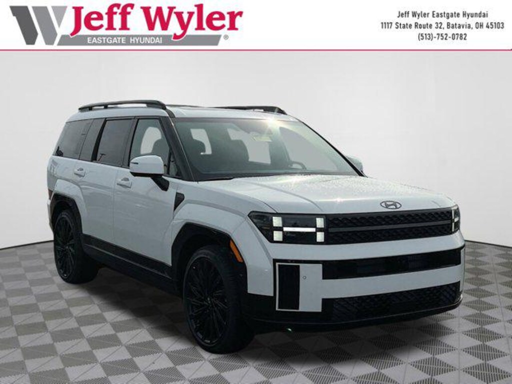 Serenity White 2026 Hyundai Santa Fe Calligraphy 2.5L I4 AWD 8-Speed Automatic with SHIFTRONIC 20/28 City/Highway MPG Jeff Wyler Eastgate Auto Mall is honored to offer this attractive 2026 Hyundai Santa Fe Calligraphy in Serenity White. Well equipped with: Option Group 01, 12 Speakers, 3rd row seats: bench, 4-Wheel Disc Brakes, ABS brakes, Air Conditioning, Alloy wheels, AM/FM radio: SiriusXM, Apple CarPlay & Android Auto, Auto High-beam Headlights, Auto-dimming Rear-View mirror, Automatic temperature control, Brake assist, Bumpers: body-color, Cargo Cover/Screen, Cargo Net, Cargo Organizer, Cargo Tray, Carpeted Floor Mats, Delay-off headlights, Driver door bin, Driver vanity mirror, Dual front impact airbags, Dual front side impact airbags, Electronic Stability Control, Emergency communication system, Exterior Parking Camera Rear, First Aid Kit, Four wheel independent suspension, Front anti-roll bar, Front Bucket Seats, Front Center Armrest, Front dual zone A/C, Front reading lights, Fully automatic headlights, Garage door transmitter: HomeLink, Heads-Up Display, Heated and Ventilated Front Bucket Seats, Heated door mirrors, Heated front seats, Heated rear seats, Heated steering wheel, Illuminated entry, Knee airbag, Leather steering wheel, Low tire pressure warning, Memory seat, Navigation System, Occupant sensing airbag, Outside temperature display, Overhead airbag, Overhead console, Panic alarm, Passenger door bin, Passenger vanity mirror, Power door mirrors, Power driver seat, Power Liftgate, Power moonroof, Power passenger seat, Power steering, Power windows, Quilted Premium Nappa Leather Seat Trim, Radio: AM/FM/HD Bose Premium Audio System, Rain sensing wipers, Rear anti-roll bar, Rear side impact airbag, Rear window defroster, Rear window wiper, Remote keyless entry, Roadside Assistance Kit, Security system, Speed control, Speed-sensing steering, Split folding rear seat, Spoiler, Steering wheel mounted audio controls, Tachometer, Telescoping steering wheel, Tilt steering wheel, Traction control, Trip computer, Turn signal indicator mirrors, Variably intermittent wipers, Ventilated front seats, and Wheels: 21" x 8.5J Unique Dark Finish Alloy. 20/28 City/Highway MPG