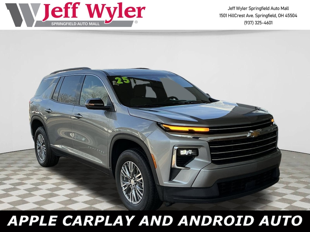 Jeff Wyler Springfield Auto Mall is very proud to offer this outstanding-looking 2025 Chevrolet Traverse LT in Sterling Gray Metallic. Well equipped with: Preferred Equipment Group 1LT, 3rd row seats: split-bench, 4-Way Manual Front Passenger Seat Adjuster, 4-Wheel Disc Brakes, 6 Speakers, 6-Speaker Audio System Feature, 8-Way Power Driver Seat Adjuster, ABS brakes, Air Conditioning, Alloy wheels, AM/FM radio: SiriusXM with 360L, Apple CarPlay/Android Auto, Auto High-beam Headlights, Automatic temperature control, Brake assist, Bumpers: body-color, Child-Seat-Sensing Airbag, Compass, Delay-off headlights, Driver door bin, Driver vanity mirror, Dual front impact airbags, Dual front side impact airbags, Electronic Stability Control, Emergency communication system: OnStar, Four wheel independent suspension, Front anti-roll bar, Front Bucket Seats, Front Center Armrest, Front dual zone A/C, Front reading lights, Fully automatic headlights, Heated door mirrors, Heated front seats, Heated steering wheel, Illuminated entry, Low tire pressure warning, Navigation System, Occupant sensing airbag, Outside temperature display, Overhead airbag, Overhead console, Panic alarm, Passenger door bin, Passenger vanity mirror, Power door mirrors, Power driver seat, Power Liftgate, Power steering, Power windows, Premium Cloth Seat Trim, Radio data system, Radio: : Audio System w/17.7" Diagonal Display, Rear air conditioning, Rear anti-roll bar, Rear reading lights, Rear window defroster, Rear window wiper, Remote keyless entry, Security system, SiriusXM with 360L Trial Subscription, Speed control, Speed-sensing steering, Spoiler, Steering wheel mounted audio controls, Tachometer, Telescoping steering wheel, Tilt steering wheel, Traction control, Trip computer, Turn signal indicator mirrors, Variably intermittent wipers, Voltmeter, and Wheels: 18" Grazen Metallic Machined-Face Aluminum. Ask about available certifications. Used vehicles 10 years of age or newer with less than 100,000 miles are eligible for the Wyler Assurance Program, but eligible vehicles must pass our reconditioning process and multi-point inspection. Provided the vehicle passes inspection, vehicles will be eligible for the 6 month/6,000 mile limited warranty. The 6 month/6,000 mile limited warranty is NOT available on AS-IS vehicles, wholesale vehicles, lease buyback/pass-thru vehicles or un-inspected vehicles. Note that this program can also apply to vehicles where the remaining factory coverage is less than 6 months or 6,000 miles. Please check the Federal Trade Commission (FTC) Buyers guide on the vehicle for full details as to whether or not warranty coverage may apply. Contact Dealer for additional details. The Wyler Assurance 6 month/6,000 Mile limited warranty ends 6 months from the date of the Retail Purchase Agreement (BUYERS ORDER) or when the vehicle's odometer registers 6,000 additional miles to the mileage listed on the BUYERS ORDER, whichever comes first. Your Deductible - The warranty holder on your contract pays the first $100 of each covered repair.