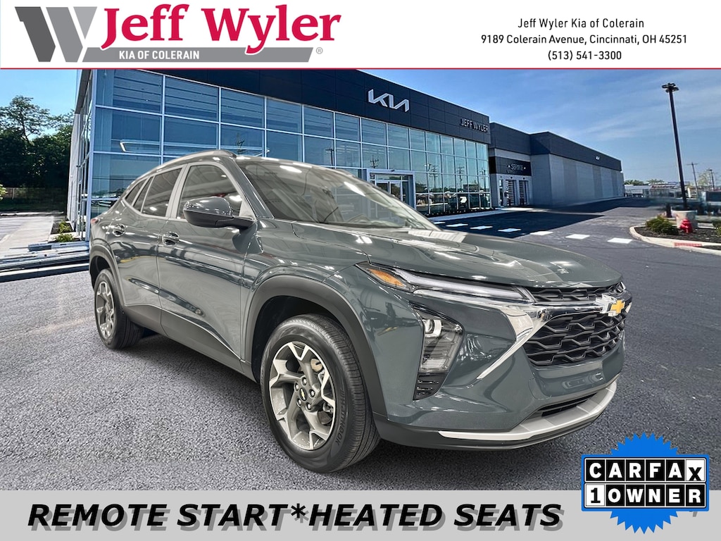 Jeff Wyler Kia of Colerain is delighted to offer this stunning 2025 Chevrolet Trax LT in Cypress Gray. Driver Confidence Package (Adaptive Cruise Control, Lane Change Alert with Side Blind Zone Alert, Rear Cross-Traffic Alert, and Rear Park Assist), License Plate Front Mounting Package, LT Convenience Package (Front Doors Keyless Open, Heated Driver and Front Passenger Seats, Heated Power-Adjustable Outside Mirrors, Heated Steering Wheel, and Wrapped Steering Wheel), Preferred Equipment Group 1LT, 2-Way Adjustable Front Head Restraints, 3.50 Final Drive Axle Ratio, 4-Way Manual Front Passenger Seat Adjuster, 4-Wheel Disc Brakes, 6 Speakers, 6-Speaker Audio System Feature, 6-Way Manual Driver Seat Adjuster, ABS brakes, Air Conditioning, Alloy wheels, AM/FM radio: SiriusXM, Auto High-beam Headlights, Automatic temperature control, Brake assist, Bumpers: body-color, Cloth/Evotex Seat Trim, Compass, Delay-off headlights, Driver door bin, Driver vanity mirror, Dual front impact airbags, Dual front side impact airbags, Electronic Stability Control, Emergency communication system: OnStar One Essentials, Exterior Parking Camera Rear, Front anti-roll bar, Front Bucket Seats, Front Center Armrest, Front reading lights, Front wheel independent suspension, Fully automatic headlights, Illuminated entry, Low tire pressure warning, Occupant sensing airbag, Outside temperature display, Overhead airbag, Overhead console, Panic alarm, Passenger door bin, Passenger vanity mirror, Power door mirrors, Power steering, Power windows, Premium audio system: Chevrolet Infotainment 3, Radio data system, Radio: AM/FM Stereo Audio System, Rear window defroster, Rear window wiper, Remote keyless entry, Security system, SiriusXM Trial Subscription, Speed control, Split folding rear seat, Spoiler, Steering wheel mounted audio controls, Tachometer, Telescoping steering wheel, Tilt steering wheel, Traction control, Trip computer, Variably intermittent wipers, and Wheels: 17 Inch Gray-Painted Machined Aluminum Alloy Our PRE-OWNED vehicles are put through a rigorous 167- POINT QUALITY ASSURANCE INSPECTION along with an average amount of over $1,400.00 SPENT to recondition each vehicle so we can be sure to deliver you the highest quality vehicle like you deserve! ***ONLINE PRICE DOES NOT INCLUDE WYLER FAMILY FIRST PACKAGE***