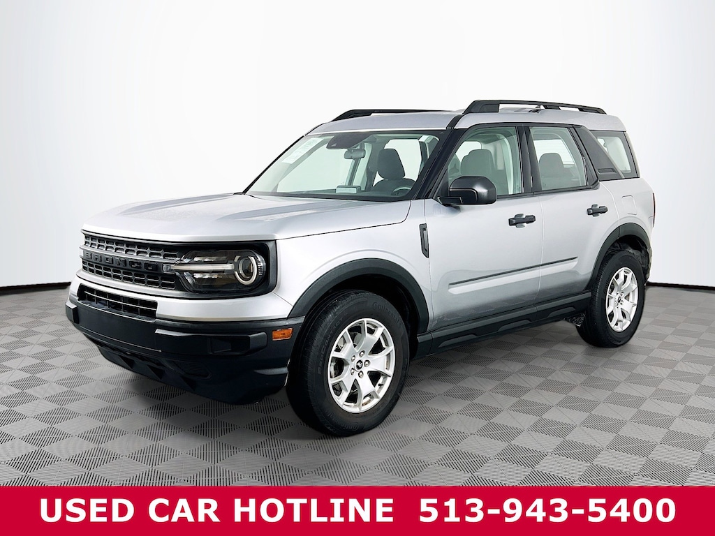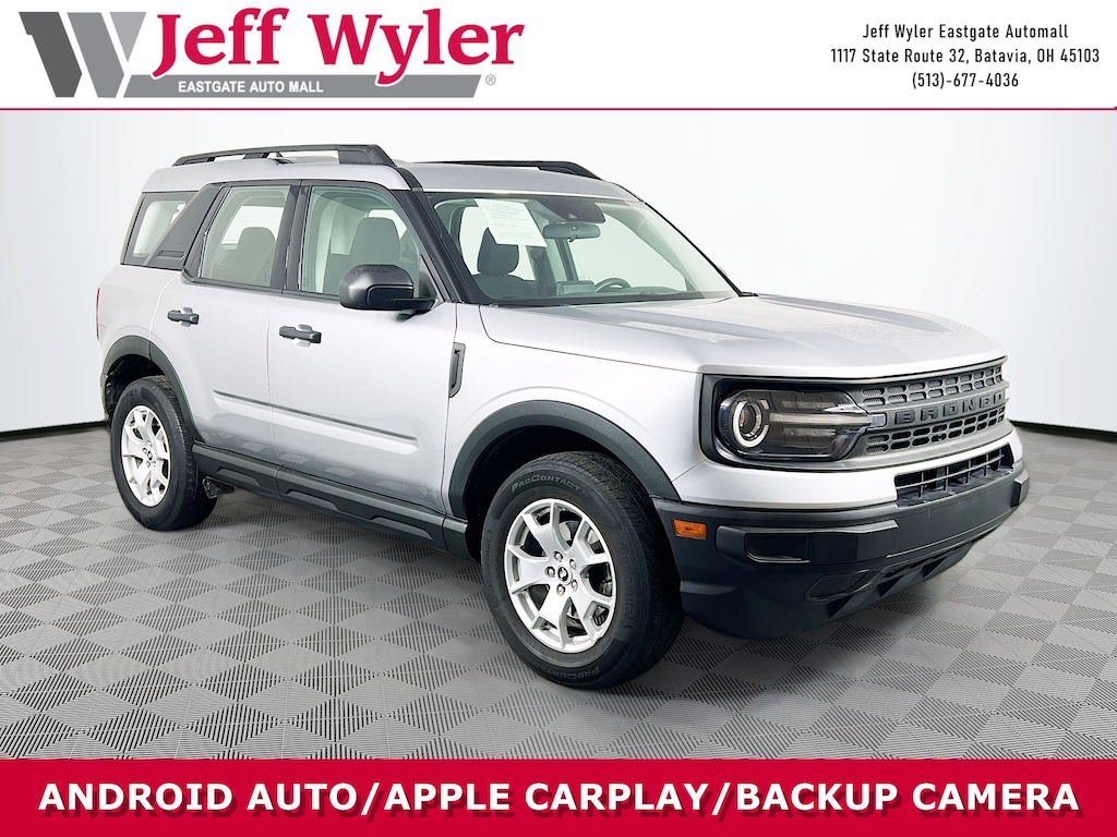 Jeff Wyler Eastgate Auto Mall is excited to offer this fantastic-looking 2022 Ford Bronco Sport in Iconic Silver Metallic. Well equipped with: Equipment Group 100A, 3.80 Axle Ratio, 4-Wheel Disc Brakes, 6 Speakers, ABS brakes, Air Conditioning, Alloy wheels, AM/FM radio, AM/FM Stereo, Auto High-beam Headlights, Brake assist, Cargo Management System, Cloth Front Bucket Seats, Compass, Delay-off headlights, Driver door bin, Driver vanity mirror, Dual front impact airbags, Dual front side impact airbags, Electronic Stability Control, Emergency communication system: SYNC 3 911 Assist, Exterior Parking Camera Rear, Four wheel independent suspension, Front anti-roll bar, Front Bucket Seats, Front Center Armrest, Front reading lights, Fully automatic headlights, Illuminated entry, Knee airbag, Low tire pressure warning, Occupant sensing airbag, Outside temperature display, Overhead airbag, Overhead console, Panic alarm, Passenger door bin, Passenger vanity mirror, Power door mirrors, Power steering, Power windows, Radio data system, Rear anti-roll bar, Rear reading lights, Rear window defroster, Rear window wiper, Remote keyless entry, Roof rack: rails only, Security system, Speed control, Speed-sensing steering, Speed-Sensitive Wipers, Split folding rear seat, Steering wheel mounted audio controls, SYNC 3 Communications & Entertainment System, SYNC 3/Apple CarPlay/Android Auto, Tachometer, Telescoping steering wheel, Tilt steering wheel, Traction control, Trip computer, Variably intermittent wipers, and Wheels: 17" Sparkle Silver. CARFAX One-Owner. Ask about available certifications. Used vehicles 10 years of age or newer with less than 100,000 miles are eligible for the Wyler Assurance Program, but eligible vehicles must pass our reconditioning process and multi-point inspection. Provided the vehicle passes inspection, vehicles will be eligible for the 6 month/6,000 mile limited warranty. The 6 month/6,000 mile limited warranty is NOT available on AS-IS vehicles, wholesale vehicles, lease buyback/pass-thru vehicles or un-inspected vehicles. Note that this program can also apply to vehicles where the remaining factory coverage is less than 6 months or 6,000 miles. Please check the Federal Trade Commission (FTC) Buyers guide on the vehicle for full details as to whether or not warranty coverage may apply. Contact Dealer for additional details. The Wyler Assurance 6 month/6,000 Mile limited warranty ends 6 months from the date of the Retail Purchase Agreement (BUYERS ORDER) or when the vehicle's odometer registers 6,000 additional miles to the mileage listed on the BUYERS ORDER, whichever comes first. Your Deductible - The warranty holder on your contract pays the first $100 of each covered repair.