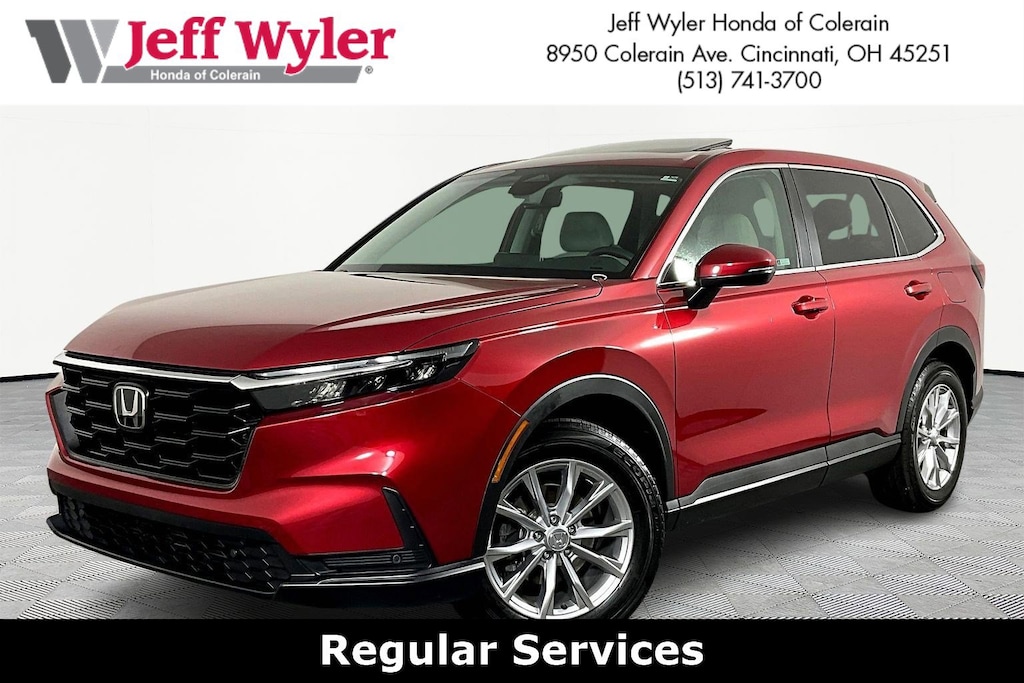 Jeff Wyler Honda of Colerain is pleased to offer this wonderful-looking 2024 Honda CR-V EX-L in Radiant Red Metallic. Well equipped with: 4-Wheel Disc Brakes, 5.64 Axle Ratio, 8 Speakers, ABS brakes, Adaptive Cruise Control: Adaptive Cruise Control (ACC) with Low-Speed Follow, Air Conditioning, Alloy wheels, AM/FM radio: SiriusXM, Auto High-beam Headlights, Auto-dimming Rear-View mirror, Automatic temperature control, Blind Spot Information (BSI) System warning, Brake assist, Bumpers: body-color, Compass, Delay-off headlights, Driver door bin, Driver vanity mirror, Dual front impact airbags, Dual front side impact airbags, Electronic Stability Control, Exterior Parking Camera Rear, Four wheel independent suspension, Front anti-roll bar, Front Bucket Seats, Front Center Armrest, Front dual zone A/C, Front reading lights, Fully automatic headlights, Heated door mirrors, Heated Front Bucket Seats, Heated front seats, Illuminated entry, Knee airbag, Leather Seat Trim, Leather Shift Knob, Leather steering wheel, Low tire pressure warning, Memory seat, Occupant sensing airbag, Outside temperature display, Overhead airbag, Overhead console, Panic alarm, Passenger door bin, Passenger vanity mirror, Power door mirrors, Power driver seat, Power Liftgate, Power moonroof, Power passenger seat, Power steering, Power windows, Radio data system, Radio: 320-Watt AM/FM/HD/SiriusXM Audio System, Rear anti-roll bar, Rear reading lights, Rear seat center armrest, Rear side impact airbag, Rear window defroster, Rear window wiper, Remote keyless entry, Security system, Speed control, Speed-sensing steering, Speed-Sensitive Wipers, Split folding rear seat, Spoiler, Steering wheel mounted audio controls, Tachometer, Telescoping steering wheel, Tilt steering wheel, Traction control, Trip computer, Turn signal indicator mirrors, Variably intermittent wipers, Wheels: 18" Sparkle Silver Metallic, and Wireless Apple CarPlay/Wireless Android Auto.