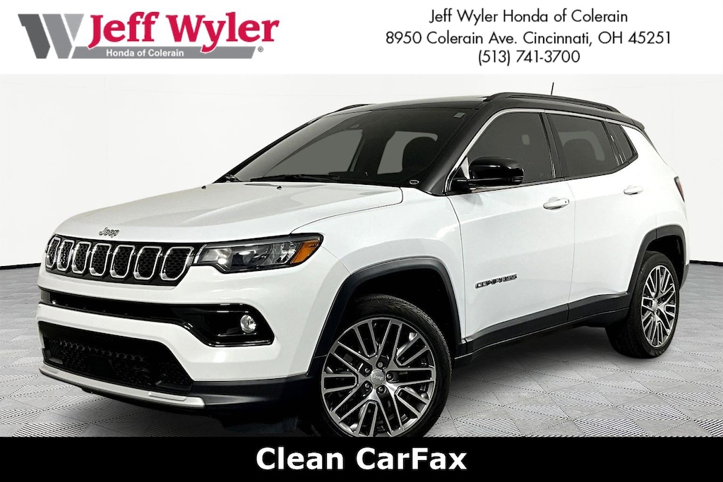 Jeff Wyler Honda of Colerain is delighted to offer this attractive-looking 2023 Jeep Compass Limited in Bright White Clearcoat. Well equipped with: Quick Order Package 29G, Sun and Sound Group (DISC) (Power Front/Fixed Rear Full Sunroof and Premium Alpine Speaker System), 10.1" Touchscreen Display, 3.73 Final Drive Ratio, 4-Wheel Disc Brakes, 6 Speakers, ABS brakes, Air Conditioning, Alloy wheels, AM/FM radio: SiriusXM, Auto High-beam Headlights, Auto-dimming Rear-View mirror, Automatic temperature control, Brake assist, Bumpers: body-color, Compass, Delay-off headlights, Disassociated Touchscreen Display, Driver door bin, Driver vanity mirror, Dual front impact airbags, Dual front side impact airbags, Electronic Stability Control, Four wheel independent suspension, Front anti-roll bar, Front Bucket Seats, Front Center Armrest w/Storage, Front dual zone A/C, Front fog lights, Front License Plate Bracket, Front reading lights, Fully automatic headlights, Heated door mirrors, Heated front seats, Heated steering wheel, Hidden Exhaust Tips-Dual, Illuminated entry, Knee airbag, Leather Shift Knob, Leatherette Seats, Low tire pressure warning, Occupant sensing airbag, Outside temperature display, Overhead airbag, Overhead console, Panic alarm, ParkView Rear Back-Up Camera, Passenger door bin, Passenger vanity mirror, Power door mirrors, Power driver seat, Power steering, Power windows, Radio: Uconnect 5 w/10.1" Display, Rain sensing wipers, Rear anti-roll bar, Rear seat center armrest, Rear window defroster, Rear window wiper, Remote keyless entry, Security system, SiriusXM Radio Service, Speed control, Split folding rear seat, Spoiler, Steering wheel mounted audio controls, Tachometer, Telescoping steering wheel, Tilt steering wheel, Traction control, Trip computer, Turn signal indicator mirrors, Variably intermittent wipers, Wheels: 18" x 7" Painted Diamond Cut Aluminum, and Wheels: 19" x 7.5" Painted Diamond Cut Aluminum.