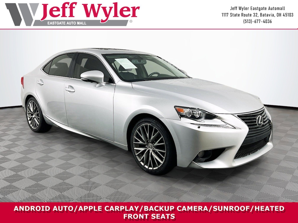 Jeff Wyler Eastgate Auto Mall is pleased to offer this stunning 2014 Lexus IS 250 in Gray. Well equipped with: 17" x 7.5" 10-Spoke Aluminum Alloy Wheels, 4-Wheel Disc Brakes, 8 Speakers, ABS brakes, Air Conditioning, Alloy wheels, AM/FM radio: SiriusXM, Auto-dimming Rear-View mirror, Automatic temperature control, Brake assist, Bumpers: body-color, CD player, Compass, Delay-off headlights, Driver door bin, Driver vanity mirror, Dual front impact airbags, Dual front side impact airbags, Electronic Stability Control, Emergency communication system: Safety Connect, Four wheel independent suspension, Front anti-roll bar, Front Bucket Seats, Front Center Armrest, Front dual zone A/C, Front fog lights, Front reading lights, Fully automatic headlights, Garage door transmitter: HomeLink, Heated door mirrors, Heated Front Bucket Seats, Heated front seats, High intensity discharge headlights: Bi-Xenon, Illuminated entry, Knee airbag, Lexus Premium Audio System, Low tire pressure warning, NuLuxe Seat Trim, Occupant sensing airbag, Outside temperature display, Overhead airbag, Overhead console, Panic alarm, Passenger door bin, Passenger vanity mirror, Power door mirrors, Power driver seat, Power moonroof, Power passenger seat, Power steering, Power windows, Radio data system, Rear anti-roll bar, Rear reading lights, Rear seat center armrest, Rear side impact airbag, Rear window defroster, Remote keyless entry, Security system, Speed control, Speed-sensing steering, Speed-Sensitive Wipers, Split folding rear seat, Steering wheel mounted audio controls, Tachometer, Telescoping steering wheel, Tilt steering wheel, Traction control, Trip computer, Turn signal indicator mirrors, and Variably intermittent wipers. Reviews: * Opting for the most visually appealing vehicle in a particular segment can sometimes mean settling for less when it comes to long-term reliability and value. Not so with the 2014 Lexus IS, as it blends eye-catching style and luxurious interior treatments with one of the most enjoyable ownership experiences in the industry. Source: KBB.com * Upscale and well-built interior; communicative steering; smooth ride. Source: EdmundsAwards: * 2014 KBB.com Best Resale Value Awards * 2014 KBB.com 5-Year Cost to Own Awards * 2014 KBB.com Brand Image Awards Ask about available certifications. Used vehicles 10 years of age or newer with less than 100,000 miles are eligible for the Wyler Assurance Program, but eligible vehicles must pass our reconditioning process and multi-point inspection. Provided the vehicle passes inspection, vehicles will be eligible for the 6 month/6,000 mile limited warranty. The 6 month/6,000 mile limited warranty is NOT available on AS-IS vehicles, wholesale vehicles, lease buyback/pass-thru vehicles or un-inspected vehicles. Note that this program can also apply to vehicles where the remaining factory coverage is less than 6 months or 6,000 miles. Please check the Federal Trade Commission (FTC) Buyers guide on the vehicle for full details as to whether or not warranty coverage may apply. Contact Dealer for additional details. The Wyler Assurance 6 month/6,000 Mile limited warranty ends 6 months from the date of the Retail Purchase Agreement (BUYERS ORDER) or when the vehicle's odometer registers 6,000 additional miles to the mileage listed on the BUYERS ORDER, whichever comes first. Your Deductible - The warranty holder on your contract pays the first $100 of each covered repair.