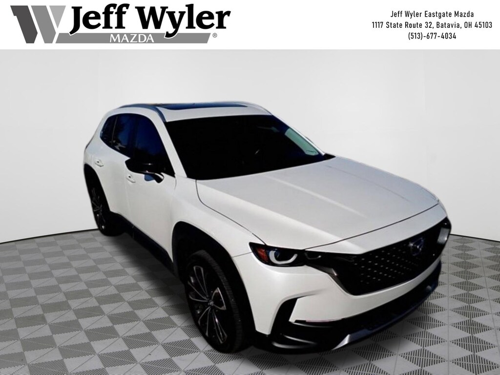 Jeff Wyler Eastgate Auto Mall is pleased to offer this attractive-looking 2024 Mazda CX-50 2.5 Turbo in Wind Chill Pearl. Well equipped with: 20" x 8J Aluminum Alloy Wheels, 3.841 Axle Ratio, 4-Wheel Disc Brakes, 8 Speakers, ABS brakes, Air Conditioning, Alloy wheels, AM/FM radio, AppLink/Apple CarPlay and Android Auto, Auto High-beam Headlights, Auto-dimming Rear-View mirror, Automatic temperature control, Brake assist, Bumpers: body-color, Compass, Delay-off headlights, Driver door bin, Driver vanity mirror, Dual front impact airbags, Dual front side impact airbags, Electronic Stability Control, Emergency communication system: MAZDA CONNECT, Exterior Parking Camera Rear, Front anti-roll bar, Front Bucket Seats, Front Center Armrest, Front dual zone A/C, Front reading lights, Front wheel independent suspension, Fully automatic headlights, Garage door transmitter: HomeLink, Heated door mirrors, Heated Front Bucket Seats, Heated front seats, Illuminated entry, Knee airbag, Leather Seat Trim, Leather Shift Knob, Leather steering wheel, Low tire pressure warning, Memory seat, Occupant sensing airbag, Outside temperature display, Overhead airbag, Overhead console, Panic alarm, Passenger door bin, Passenger vanity mirror, Power door mirrors, Power driver seat, Power Liftgate, Power moonroof, Power passenger seat, Power steering, Power windows, Radio data system, Radio: AM/FM/HD Audio System, Rain sensing wipers, Rear seat center armrest, Rear window defroster, Rear window wiper, Remote keyless entry, Speed control, Speed-sensing steering, Split folding rear seat, Spoiler, Steering wheel mounted audio controls, Tachometer, Telescoping steering wheel, Tilt steering wheel, Traction control, Trip computer, Turn signal indicator mirrors, Variably intermittent wipers, and Wind Chill Pearl Paint Charge. Clean CARFAX. Ask about available certifications. Used vehicles 10 years of age or newer with less than 100,000 miles are eligible for the Wyler Assurance Program, but eligible vehicles must pass our reconditioning process and multi-point inspection. Provided the vehicle passes inspection, vehicles will be eligible for the 6 month/6,000 mile limited warranty. The 6 month/6,000 mile limited warranty is NOT available on AS-IS vehicles, wholesale vehicles, lease buyback/pass-thru vehicles or un-inspected vehicles. Note that this program can also apply to vehicles where the remaining factory coverage is less than 6 months or 6,000 miles. Please check the Federal Trade Commission (FTC) Buyers guide on the vehicle for full details as to whether or not warranty coverage may apply. Contact Dealer for additional details. The Wyler Assurance 6 month/6,000 Mile limited warranty ends 6 months from the date of the Retail Purchase Agreement (BUYERS ORDER) or when the vehicle's odometer registers 6,000 additional miles to the mileage listed on the BUYERS ORDER, whichever comes first. Your Deductible - The warranty holder on your contract pays the first $100 of each covered repair.