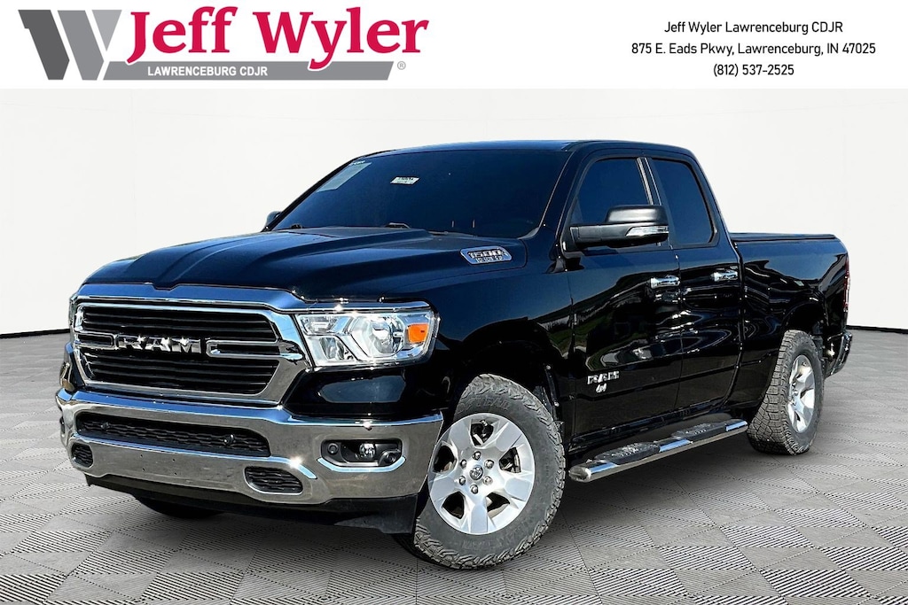 Jeff Wyler Chrysler Dodge Jeep of Lawrenceburg is pleased to offer this superb-looking 2021 Ram 1500 Big Horn/Lone Star in Diamond Black Crystal Pearlcoat. Big Horn Level 2 Equipment Group (115V Auxiliary Power Outlet, 115V Auxiliary Rear Power Outlet, 400W Inverter, Air Conditioning ATC w/Dual Zone Control, Auto-Dimming Exterior Driver Mirror, Auto-Dimming Rear-View Mirror, Black Premium Power Mirrors, Class IV Receiver Hitch, Cluster 7.0" TFT Color Display, Exterior Mirrors Courtesy Lamps, Exterior Mirrors w/Supplemental Signals, Foam Bottle Insert (Door Trim Panel), For More Info, Call 800-643-2112, Glove Box Lamp, Heated Front Seats, Heated Steering Wheel, Media Hub w/2 Charge Only USBs, ParkSense Front/Rear Park Assist w/Stop, Power 4-Way Driver Lumbar Adjust, Power 8-Way Driver Seat, Power Adjustable Pedals, Power-Folding Mirrors, Rear Dome w/On/Off Switch Lamp, Rear Power Sliding Window, Rear Window Defroster, Security Alarm, SiriusXM Radio Service, Sun Visors w/Illuminated Vanity Mirrors, and Universal Garage Door Opener), Quick Order Package 25Z Big Horn (Big Horn Badge), 3 Rear Seat Head Restraints, 3.21 Rear Axle Ratio, 4 Way Front Headrests, 4-Wheel Disc Brakes, 40/20/40 Split Bench Seat, 48V Belt Starter Generator, 6 Speakers, ABS brakes, Air Conditioning, Alloy wheels, AM/FM radio, Black Exterior Mirrors, Brake assist, Bumpers: chrome, Cloth Bench Seat, Compass, Delay-off headlights, Driver door bin, Dual front impact airbags, Dual front side impact airbags, Electronic Stability Control, Front anti-roll bar, Front Center Armrest w/Storage, Front fog lights, Front reading lights, Front Seat Back Map Pockets, Front wheel independent suspension, Fully automatic headlights, GPS Antenna Input, Heated door mirrors, Illuminated entry, Integrated Voice Command w/Bluetooth, Leather steering wheel, Low tire pressure warning, Manual Adjust 4-Way Front Passenger Seat, MOPAR Front & Rear Rubber Floor Mats, Occupant sensing airbag, Outside temperature display, Overhead airbag, Overhead console, Panic alarm, ParkView Rear Back-Up Camera, Passenger door bin, Passenger vanity mirror, Power door mirrors, Power steering, Power windows, Radio data system, Radio: Uconnect 3 w/5" Display, Radio: Uconnect 4 w/8.4" Display, Rear 60/40 Folding Seat, Rear anti-roll bar, Rear seat center armrest, Rear step bumper, Rear Wheelhouse Liners, Remote keyless entry, Remote Start System, Speed control, Split folding rear seat, Steering wheel mounted audio controls, Tachometer, Telescoping steering wheel, Tilt steering wheel, Traction control, Trailer Brake Control, Trip computer, Variably intermittent wipers, Voltmeter, and Wheels: 18" x 8" Cast-Aluminum Painted Our PRE-OWNED vehicles are put through a rigorous 167- POINT QUALITY ASSURANCE INSPECTION along with an average amount of over $1,400.00 SPENT to recondition each vehicle so we can be sure to deliver you the highest quality vehicle like you deserve! ***ONLINE PRICE DOES NOT INCLUDE WYLER FAMILY FIRST PACKAGE*** Stop by 4136 Shelbyville Road to see for yourself, or give us a call @ 502-897-3151 to schedule your test drive! Ask about available certifications.