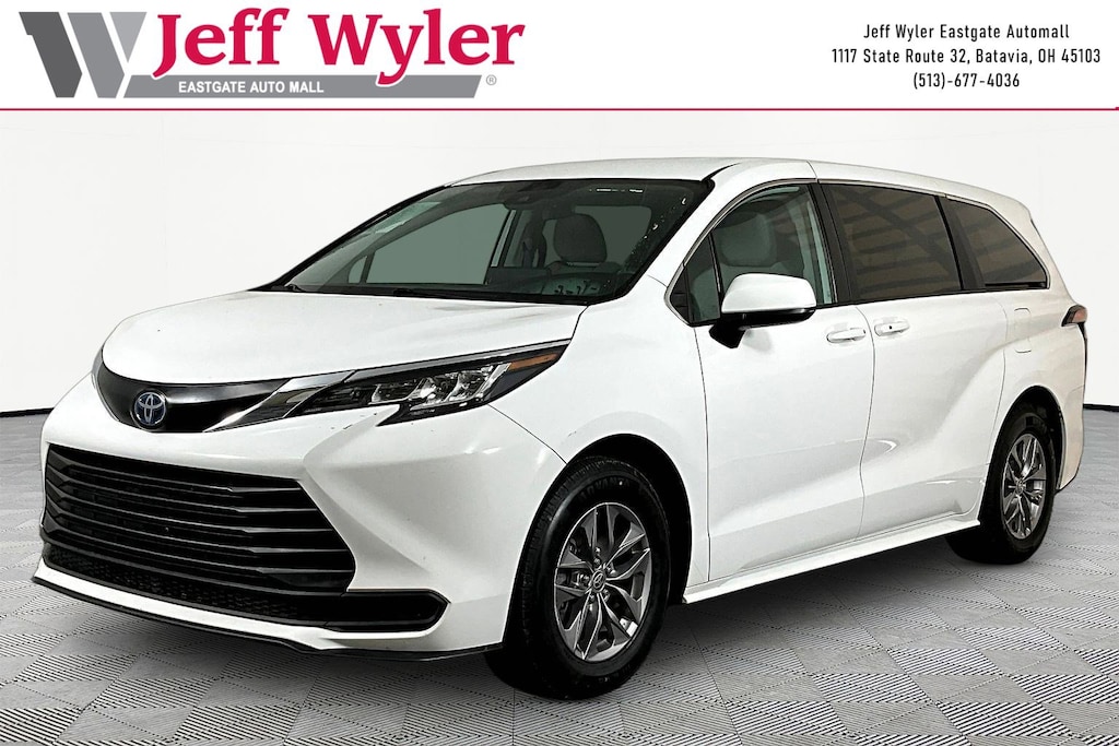 Jeff Wyler Eastgate Auto Mall is excited to offer this beautiful-looking 2022 Toyota Sienna LE in White. Well equipped with: 17" Alloy Wheels, 3rd row seats: split-bench, 4-Wheel Disc Brakes, 6 Speakers, ABS brakes, Air Conditioning, Alloy wheels, AM/FM radio: SiriusXM, Apple CarPlay/Android Auto, Auto High-beam Headlights, Auto-dimming door mirrors, Automatic temperature control, Axle Ratio: TBA, Brake assist, Bumpers: body-color, Compass, Delay-off headlights, Door auto-latch, Driver door bin, Driver vanity mirror, Driver's Seat Mounted Armrest, Dual front impact airbags, Dual front side impact airbags, Electronic Stability Control, Emergency communication system: Safety Connect with 1-year trial, Exterior Parking Camera Rear, Fabric Seat Material, Four wheel independent suspension, Front anti-roll bar, Front Bucket Seats, Front dual zone A/C, Front reading lights, Fully automatic headlights, Heated door mirrors, Illuminated entry, Knee airbag, Lane Departure Warning System, Low tire pressure warning, Occupant sensing airbag, Outside temperature display, Overhead airbag, Overhead console, Panic alarm, Passenger door bin, Passenger seat mounted armrest, Passenger vanity mirror, Power door mirrors, Power driver seat, Power steering, Power windows, Radio data system, Radio: Audio System, Rear air conditioning, Rear anti-roll bar, Rear reading lights, Rear seat center armrest, Rear side impact airbag, Rear window defroster, Rear window wiper, Reclining 3rd row seat, Remote keyless entry, Speed control, Speed-sensing steering, Split folding rear seat, Spoiler, Steering wheel mounted audio controls, Tachometer, Telescoping steering wheel, Tilt steering wheel, Traction control, Trip computer, Turn signal indicator mirrors, and Variably intermittent wipers. Ask about available certifications. Used vehicles 10 years of age or newer with less than 100,000 miles are eligible for the Wyler Assurance Program, but eligible vehicles must pass our reconditioning process and multi-point inspection. Provided the vehicle passes inspection, vehicles will be eligible for the 6 month/6,000 mile limited warranty. The 6 month/6,000 mile limited warranty is NOT available on AS-IS vehicles, wholesale vehicles, lease buyback/pass-thru vehicles or un-inspected vehicles. Note that this program can also apply to vehicles where the remaining factory coverage is less than 6 months or 6,000 miles. Please check the Federal Trade Commission (FTC) Buyers guide on the vehicle for full details as to whether or not warranty coverage may apply. Contact Dealer for additional details. The Wyler Assurance 6 month/6,000 Mile limited warranty ends 6 months from the date of the Retail Purchase Agreement (BUYERS ORDER) or when the vehicle's odometer registers 6,000 additional miles to the mileage listed on the BUYERS ORDER, whichever comes first. Your Deductible - The warranty holder on your contract pays the first $100 of each covered repair.